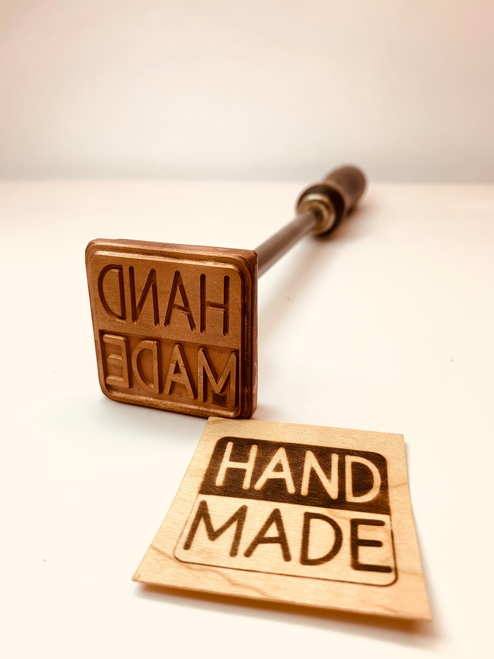 Pre-made flame heated branding iron featuring the design: HAND MADE at 1.5 inch wide and tall.